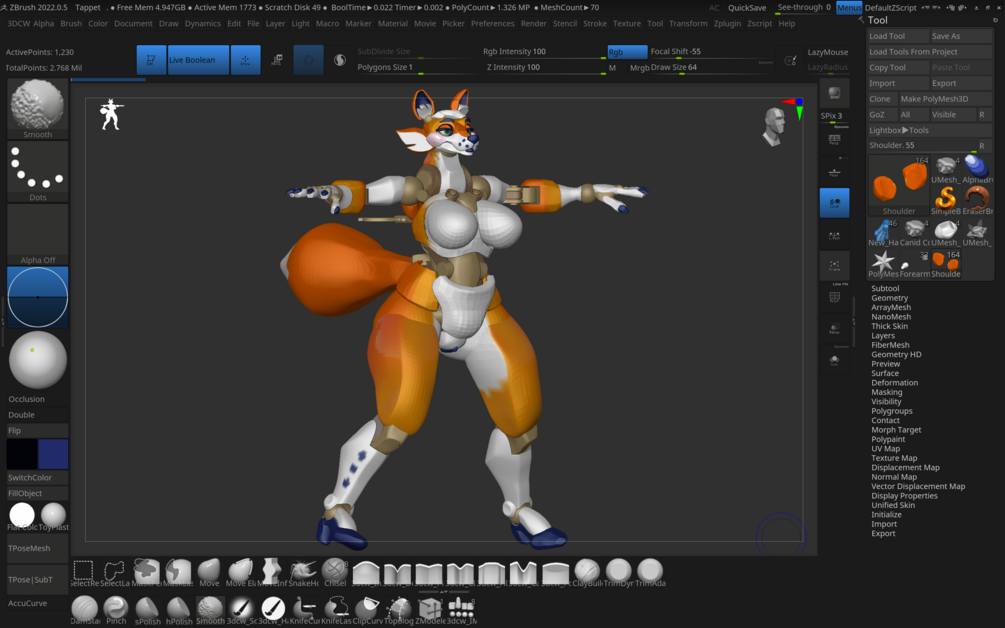 Included is a Blender 3.3 file and a ZBrush 2022 file. The Blender file contains a fully rigged model, while the Zbrush file contains much of the source meshes as well as some additional things.